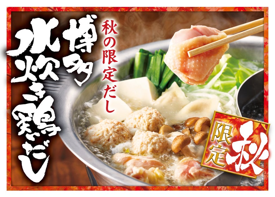 秋期間限定の「博多水炊き鶏だし」は、2種の鶏油と鶏ガラを贅沢に使用した濃厚な白湯だし。瀬戸内産の塩で旨味が凝縮され、まろやかでコク深いだしに仕上げました。「若鶏もも」や「水炊き野菜盛り合わせ」を味わった後のシメは「ちぢれ中華麺」で決まり!素材の旨味が詰まった「博多水炊き鶏だし」を、最後までご堪能ください。