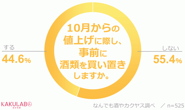 こうしたなか、10月からの値上げに備えて事前に酒類を買い置きするかどうかを聞いてみたところ、買い置きを「する」派は45%、「しない」派は55%で、「しない」派が10ポイント上回りました。