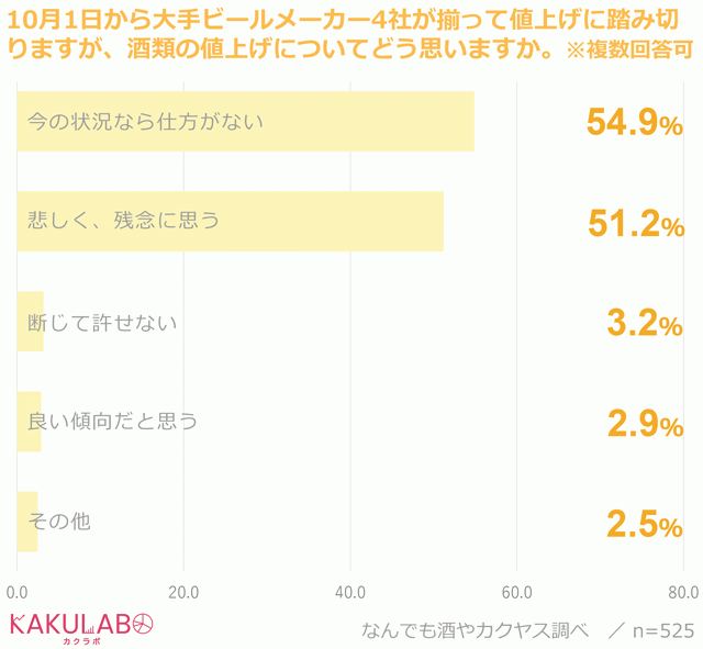 株式会社カクヤス(本社:東京都北区、代表取締役社長:佐藤順一、以下:当社)は、10月1日より大手ビールメーカーが酒類の値上げを発表したことを受け、カクヤスメールマガジンに登録している当社のユーザーを対象に、「酒類の値上げ」について実際どう思っているか、値上げに向けての節約術などアンケート調査を行いました。