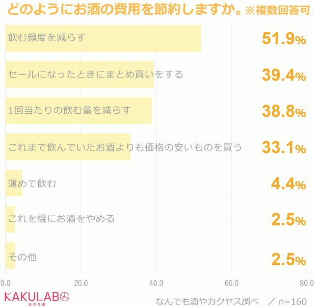 では、「節約する」派はどのように節約するのでしょうか。複数回答可で聞いてみたところ、最も多かったのは「飲む頻度を減らす」52%でした。次いで「1回当たりの飲む量を減らす」と「セールになったときにまとめ買いをする」が同率の39%、「これまで飲んでいたお酒よりも価格の安いものを買う」33%と続きます。