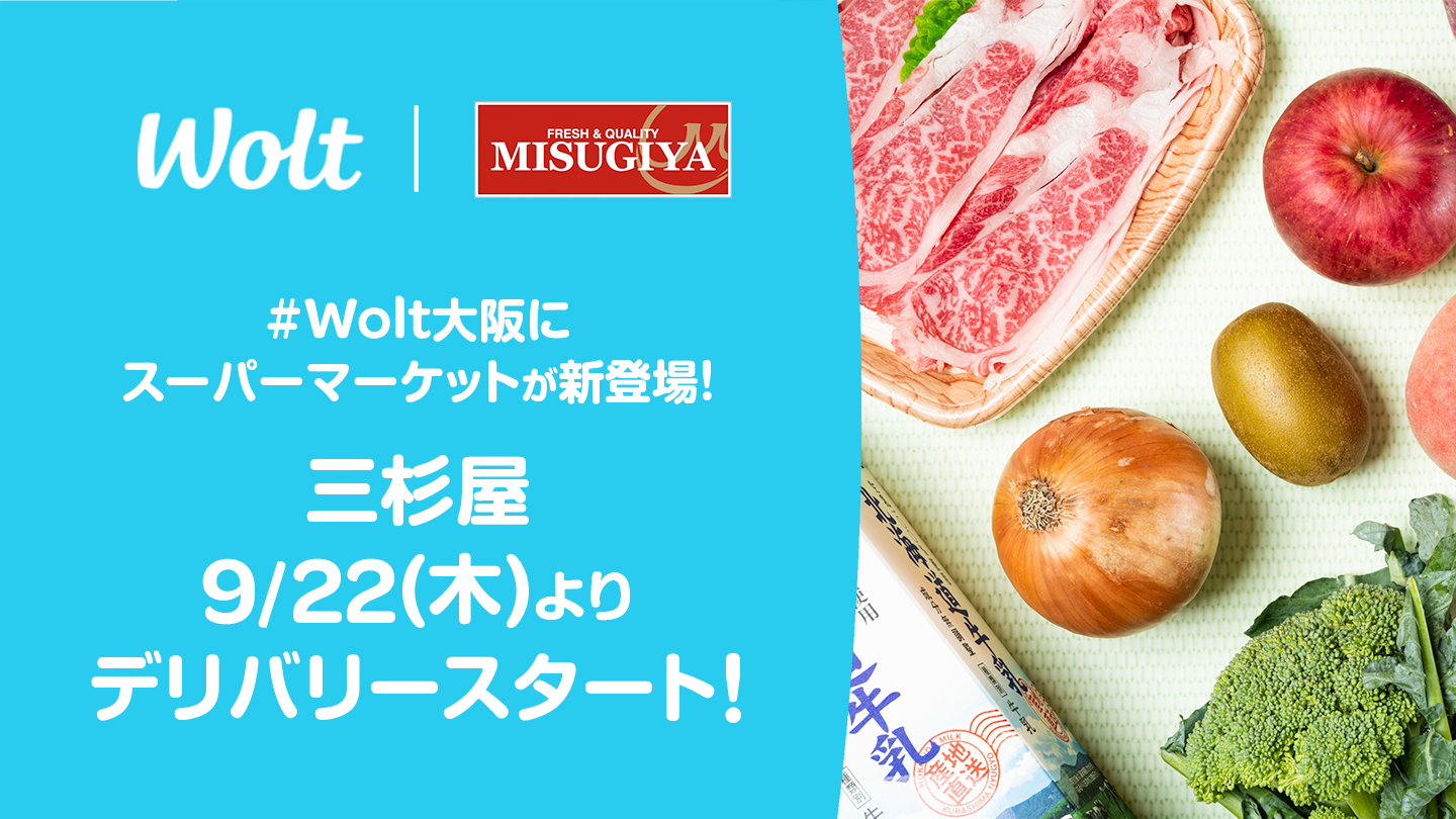 デリバリーサービス「Wolt(ウォルト)」を展開するWolt Japan株式会社はこのたび株式会社三杉屋(本社:兵庫県神戸市)の商品取り扱いを開始し、2022年9月22日(木)より「三杉屋ホームズ南津守店」「MISUGIYA+福島店」でのデリバリーサービスをスタートいたします。Woltが大阪市内においてスーパーマーケットとの取り組みを開始するのは今回が初となります。生鮮食品や日配品などを豊富に取り揃え、ご注文から30分程度でご自宅などご希望の場所にお届けします。また、サービス開始を記念して2022年9月22日(木)から10月19日(水)まで期間限定キャンペーンを実施します。