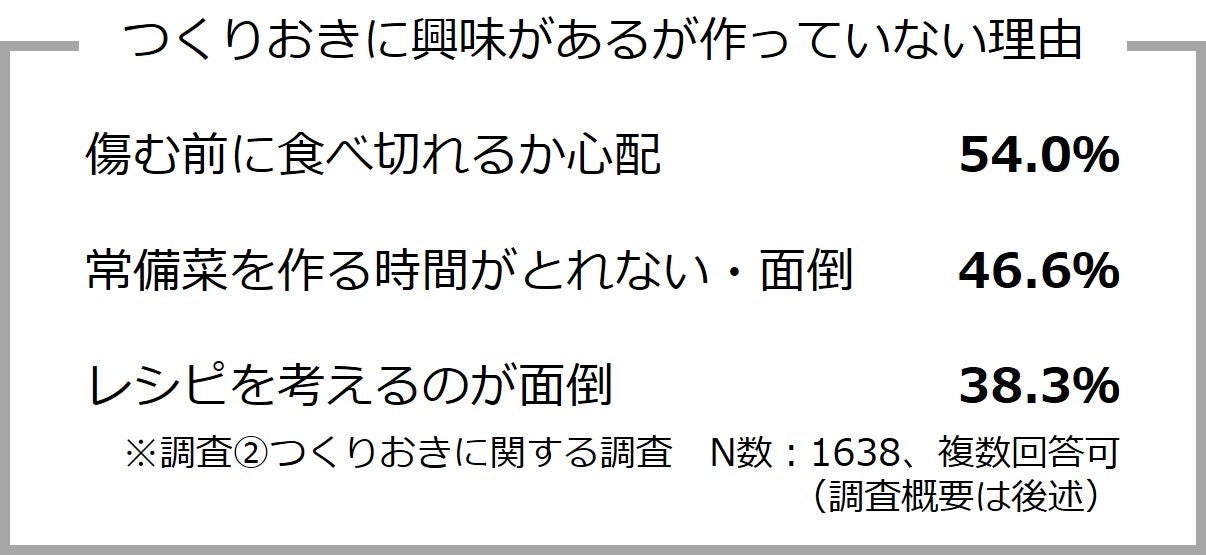 旭化成ホームプロダクツの調査によると、料理する人の約8割は献立づくりに悩んでおり(※調査①: 「献立づくり」に関する意識調査)、また当社によるつくりおきに関する調査(※調査②)によると、保存方法や調理時間、レシピを考える手間などが理由で作らない、と回答する方が多くいることが分かりました。