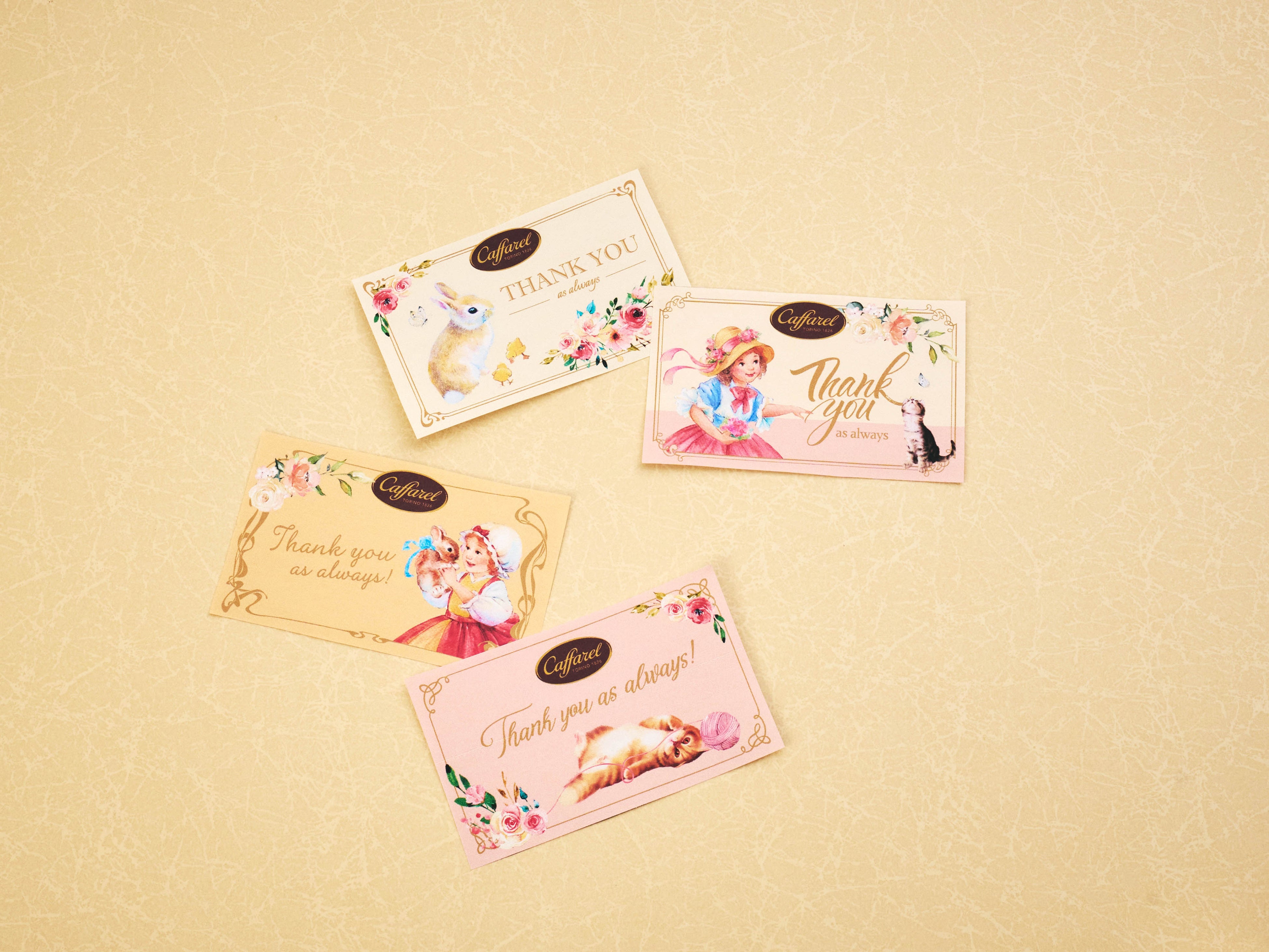 オリジナルメッセージカードは全4種類。いずれも「Thank you」メッセージとともに、愛らしい表情の動物や女の子のイラストが、優しいタッチで描かれています。