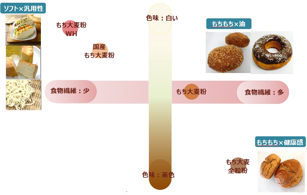 はくばくのもち大麦粉は、使用用途に合わせたラインナップを展開。食感を付与したい、食物繊維をプラスしてヘルシーなレシピに仕上げたいといったニーズに応えます。