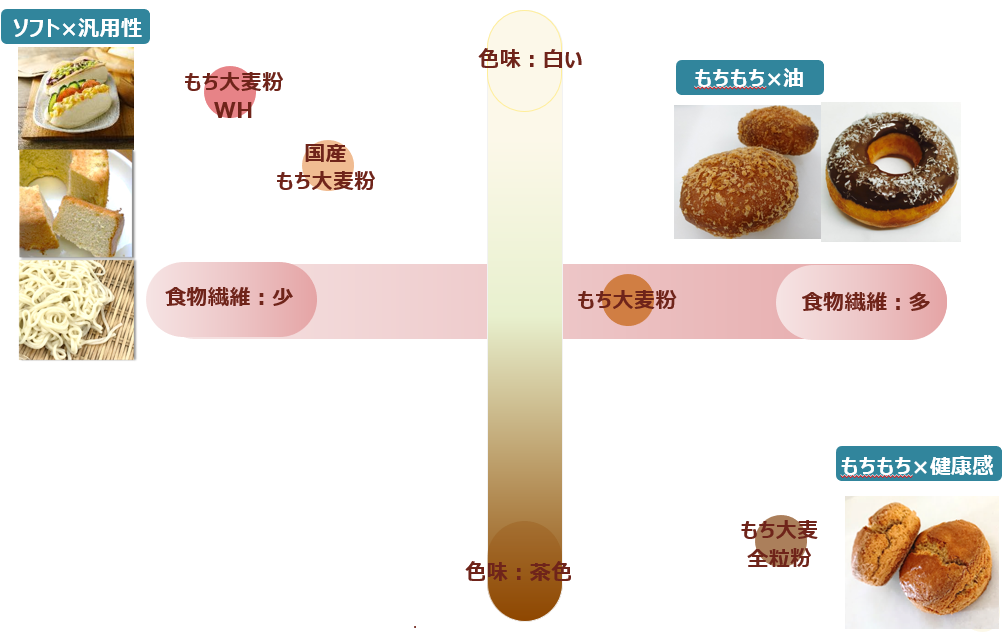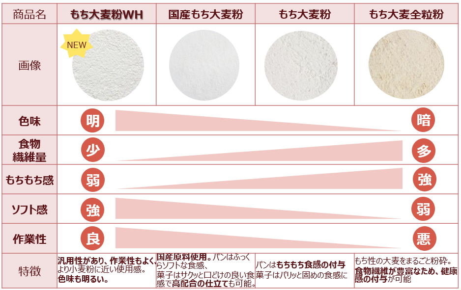 はくばくのもち大麦粉は、使用用途に合わせたラインナップを展開。食感を付与したい、食物繊維をプラスしてヘルシーなレシピに仕上げたいといったニーズに応えます。