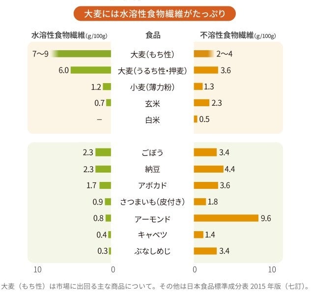 食物繊維には便のカサを増して腸の動きをよくする不溶性と、食後高血糖を防いだり、腸内細菌のエサとなって腸内環境を整えたりしてくれる水溶性の2種類があり、「もち麦」には不溶性と水溶性のWの食物繊維がバランス良く豊富に含まれています。