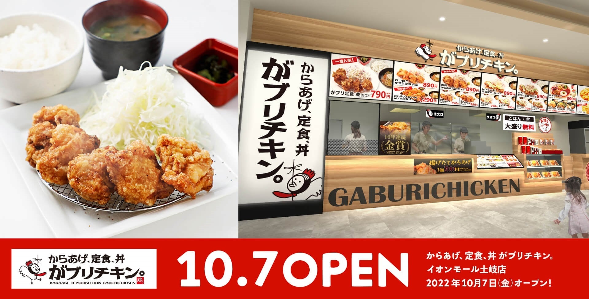 株式会社ブルームダイニングサービス(所在地:名古屋市中村区、代表取締役:杉村 明紀)が運営する飲食ブランド「がブリチキン。」は、新業態である「からあげ、定食、丼 がブリチキン。」岐阜2号店となる「イオンモール土岐店」を、2022年10月7日(金)にグランドオープンいたします。愛知県にある新業態1号店の「ららぽーと名古屋みなとアクルス店」では、老若男女問わず親しまれており、「がブリチキン。から、定食や丼が出てくれて嬉しい」「お買い物帰りにテイクアウトが出来て、ご飯のおかずが助かる」などと、大好評をいただいております。