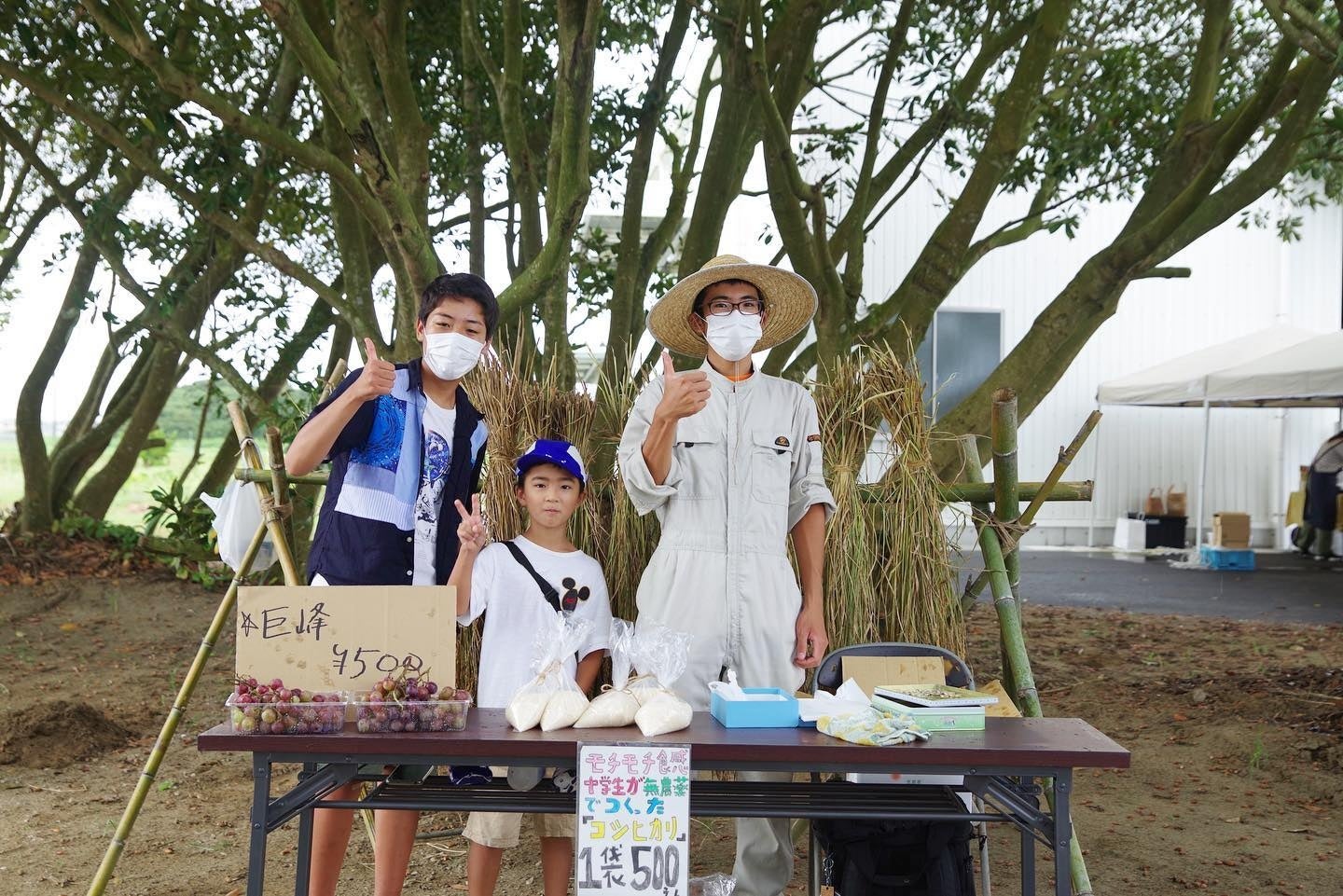 今回、地元の仲良し学生たちが無農薬栽培したコシヒカリと巨峰も販売いただきました。