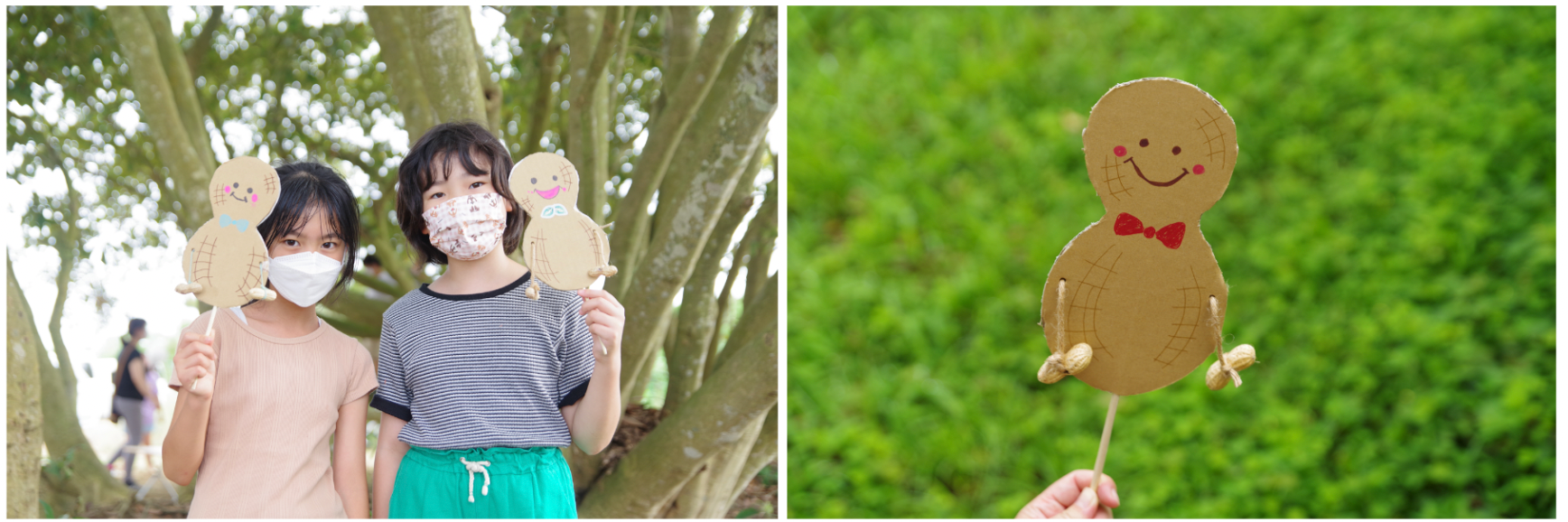 子どもたちが楽しんで工作をするピーナッツのでんでん太鼓づくりでは、ピーナッツの形に切り抜かれた段ボールに割り箸を挿して、からつき落花生を紐で縛ったものを腕に見立ててでんでん太鼓を作ります。子どもたちは自分の好きなアニメやゲームのキャラなど、思い思いのイラストを書き込み個性豊かなでんでん太鼓がたくさん誕生しました。