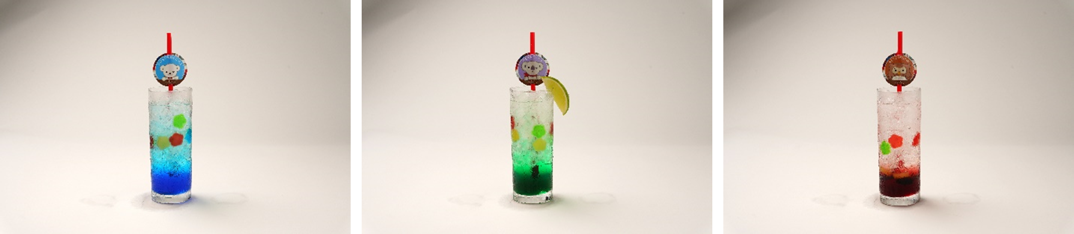 〈材料〉ベースシロップ3種(グレナデン、ブルーキュラソー、ミント・ライム)・サイダー・花形ゼリー
