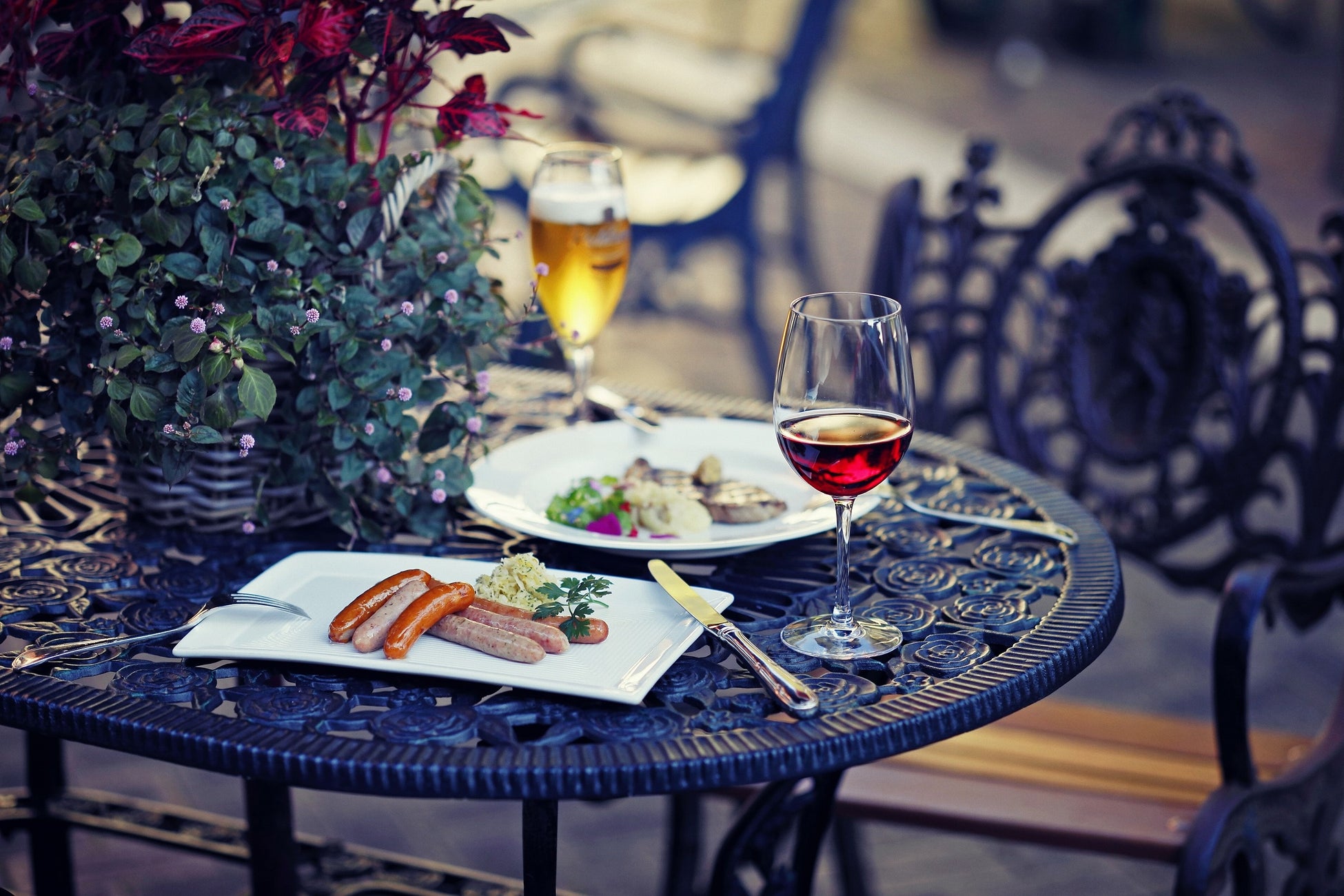 また、ご飲食をお楽しみいただくテーブルには、コーラルやレッドのインパチェンスなどの寄せ植えで飾花をし、どこにいても彩りのある空間を演出しています。