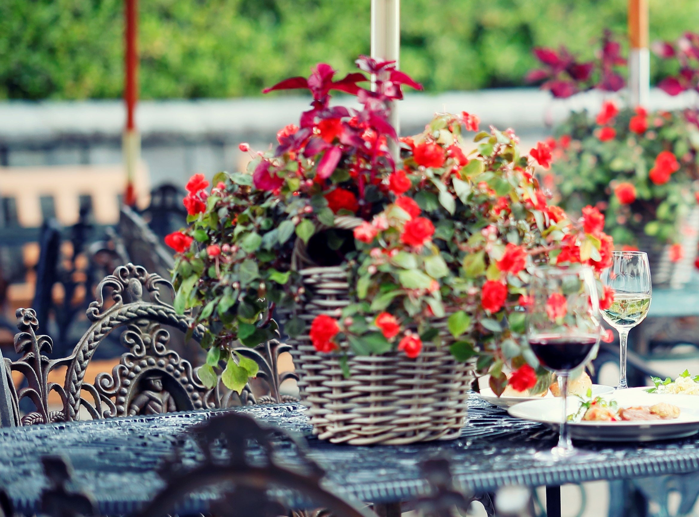 また、ご飲食をお楽しみいただくテーブルには、コーラルやレッドのインパチェンスなどの寄せ植えで飾花をし、どこにいても彩りのある空間を演出しています。