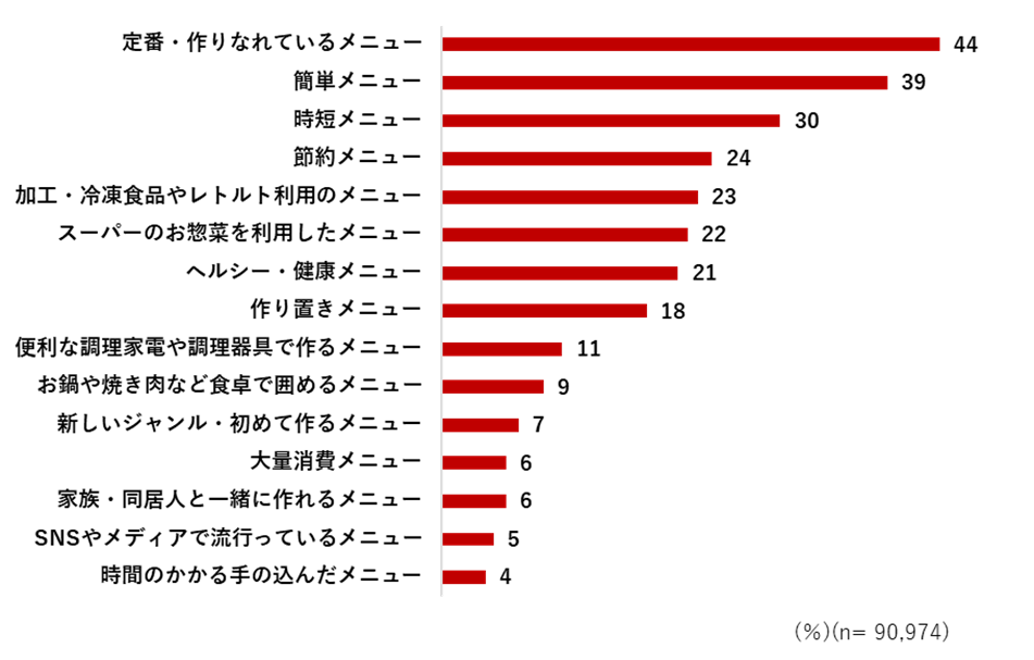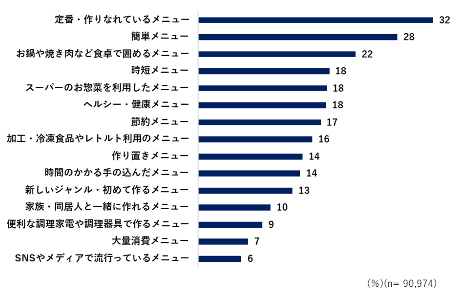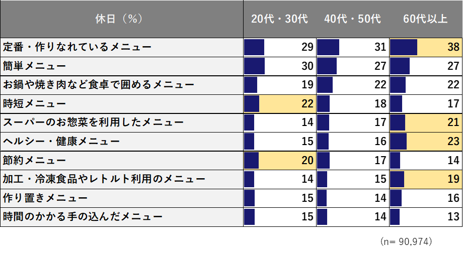 一方、休日の上位となった「お鍋や焼き肉など食卓で囲めるメニュー」「時間のかかる手の込んだメニュー」は、それぞれ平日より約10ポイント高い結果となった。