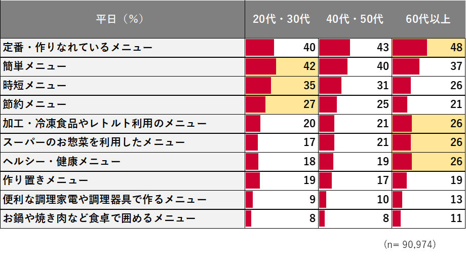 20代・30代は時短・コスパ志向。60代以上は健康メニューやお惣菜、加工・冷凍食品を献立へ活用