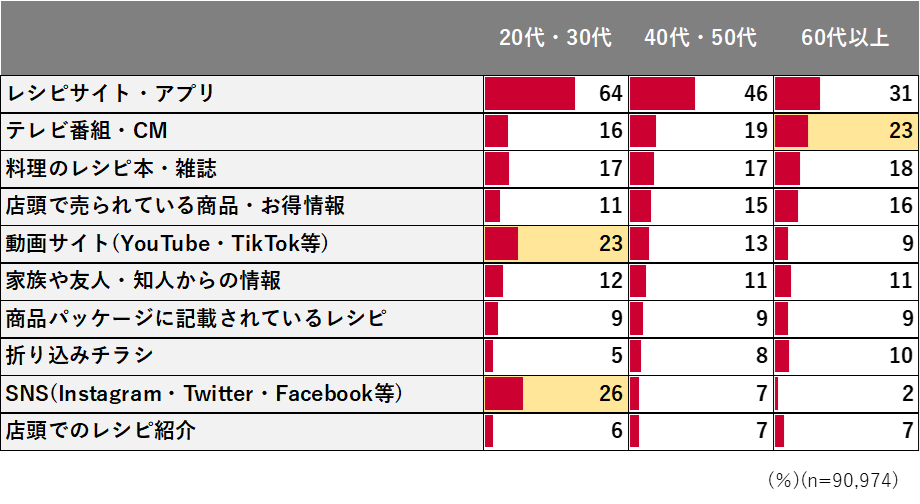 年代別でみると、60代以上では「テレビ番組・CM」を参考とする人が他の年代と比べて多かった。20代・30代では「動画サイト」「SNS」を参考とする人が多く、オンラインサービスを活用して献立を検討する傾向がみられる。