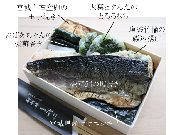 ●従来から「海苔弁山登り」に使用している宮城県石巻産ササニシキに加えて、金華鯖、塩釜竹輪等の宮城県の食材をふんだんに使用、紫蘇巻き等の宮城県の郷土料理も盛り込み、宮城県の「食」を存分にお楽しみいただける内容です。