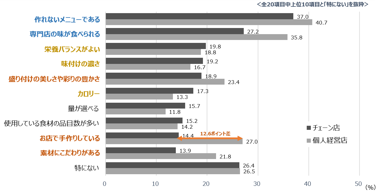 料理について気にしていることは、チェーン店・個人経営店いずれも「作れないメニューである」が最も多く、次いで「専門店の味が食べられる」が挙がりました。個人経営店では「お店で手作りしている」が27.0%と、チェーン店との差が12.6ポイントで最大となったほか、「素材にこだわりがある」「盛り付けの美しさや彩りの豊かさ」も比較的多く、2割を上回りました。チェーン店では「栄養バランスがよい」「味付けの濃さ」「カロリー」が比較的多く、2割近く挙がりました。(レポート7頁参照)