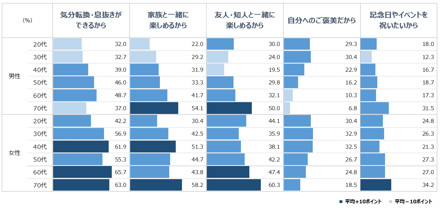 - 70代は記念日やイベントを皆で祝いたい、若年層は自分へのご褒美にも