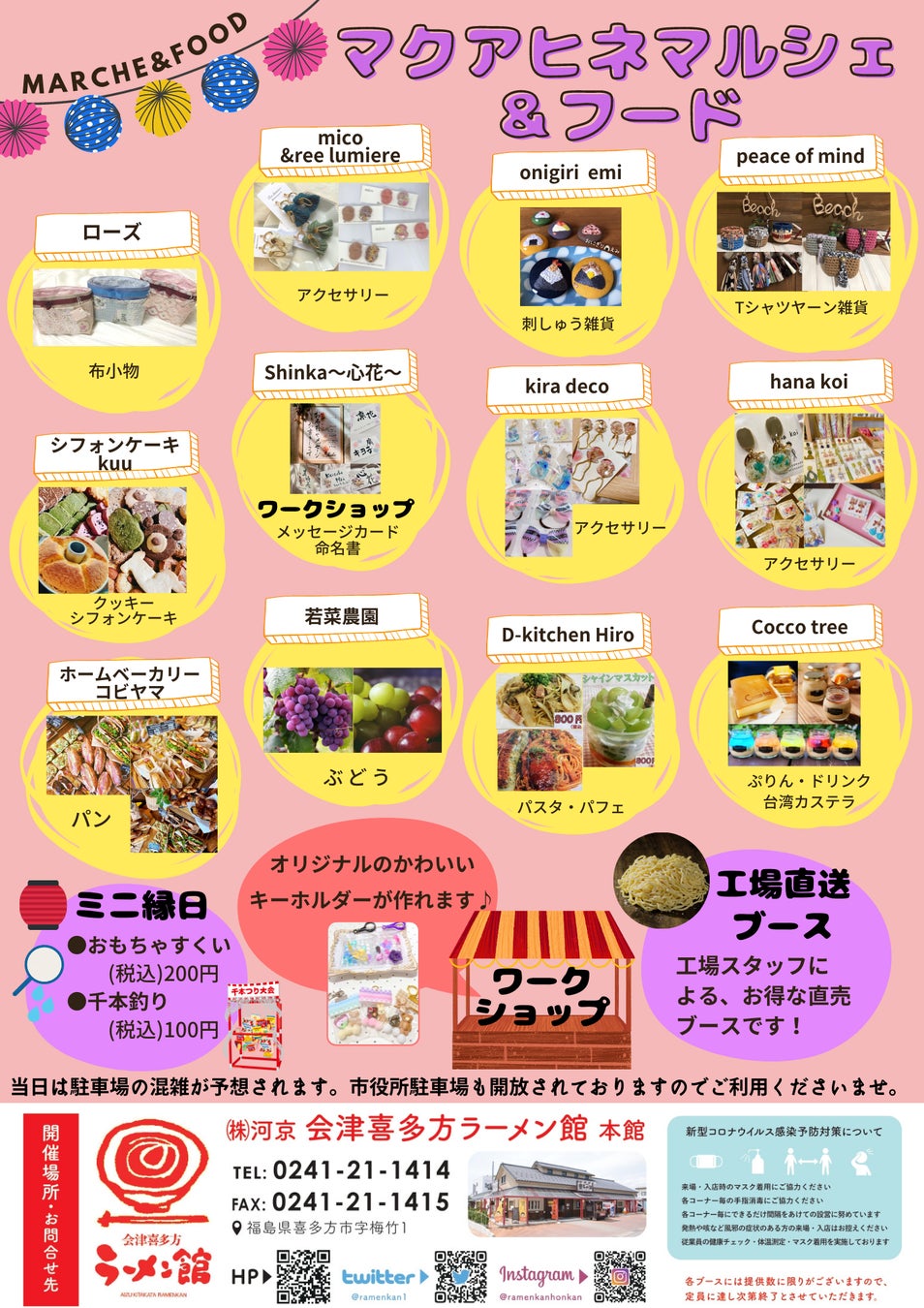 ラーメン館と同じ河京グループのカフェCocco tree(コッコツリー)が出店。台湾カステラ、こっこぷりんを販売します。他にもシフォンケーキやクッキー販売のシフォンケーキkuu、パスタやパフェの販売を行うキッチンカー D-kitchen Hiro、会津若松市のホームベーカリーkobiyamaのパン販売、喜多方の若菜農園のぶどう販売を行ないます。普段店頭にはないイベント限定商品もございますので是非この機会をお見逃しなく!