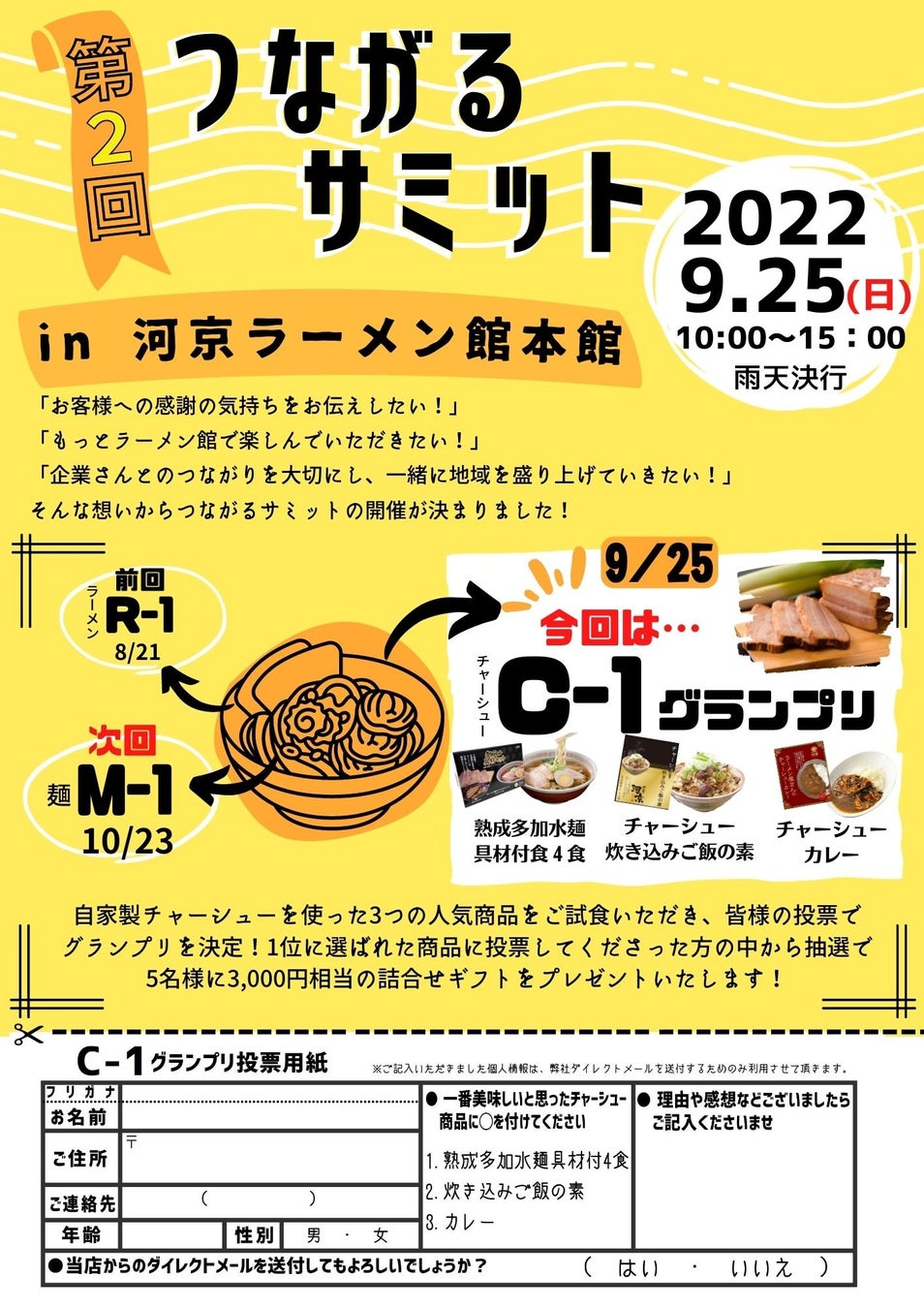 地域密着イベント「つながるサミット」の第2回目を9月25日に河京ラーメン館本館にて開催します。