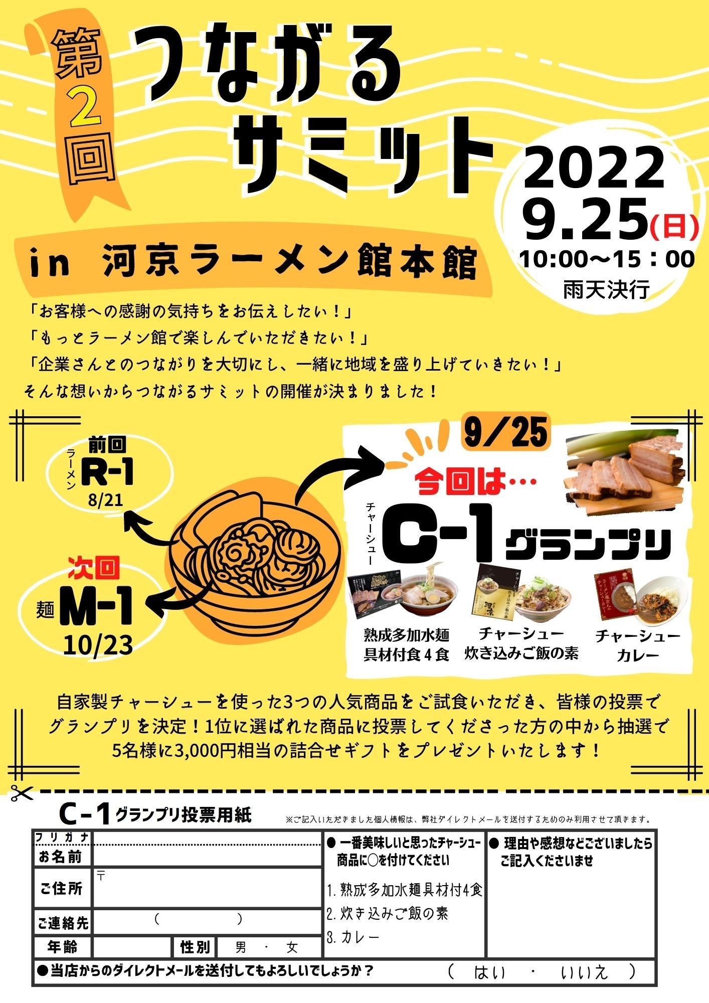 河京自慢の自家製チャーシューを使った3種類の人気商品(熟成多加水麺4食具材付、チャーシュー炊き込みご飯の素、チャーシューカレー)の試食を行い、一番美味しいと思った商品に投票。1位になった商品に投票した方の中から抽選で5名様に詰合せギフトをプレゼントいたします。