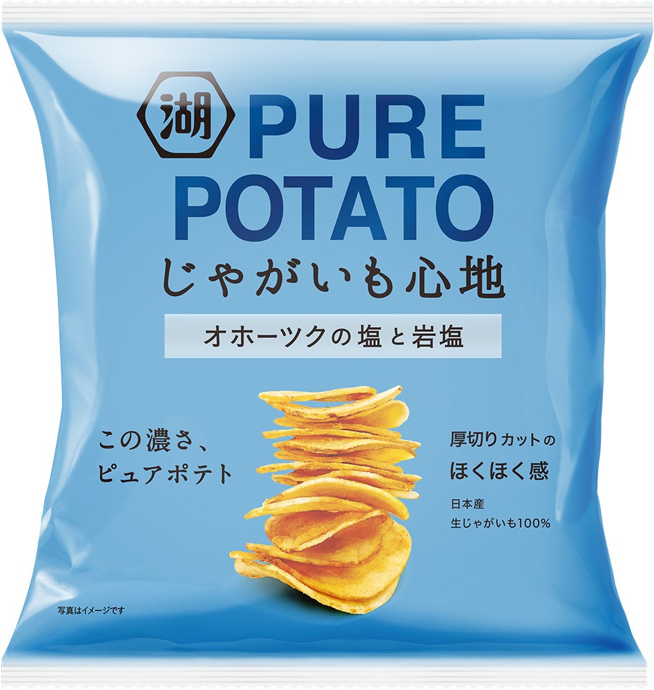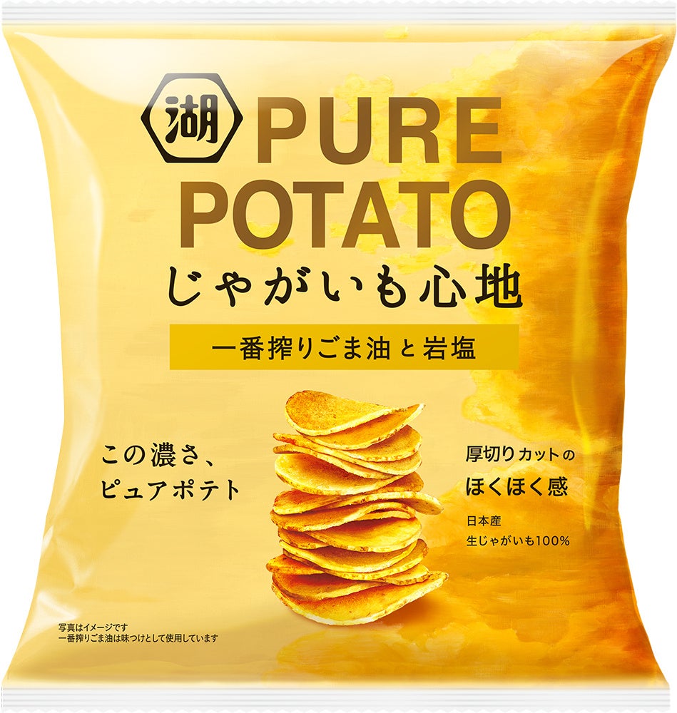 素材にこだわり、国産生じゃがいもを贅沢な厚さにスライスして揚げた「PURE POTATO じゃがいも心地」 は、じゃがいもの濃い味わいと特有のホクホク感で、“じゃがいもを味わう”厚切りポテトチップスとしてお客様にご好評をいただいています。じゃがいも本来の濃い味わいと、それに負けないしっかりとした味付けの相乗効果によって、1枚1枚食べごたえのある味わいをお楽しみいただけます。