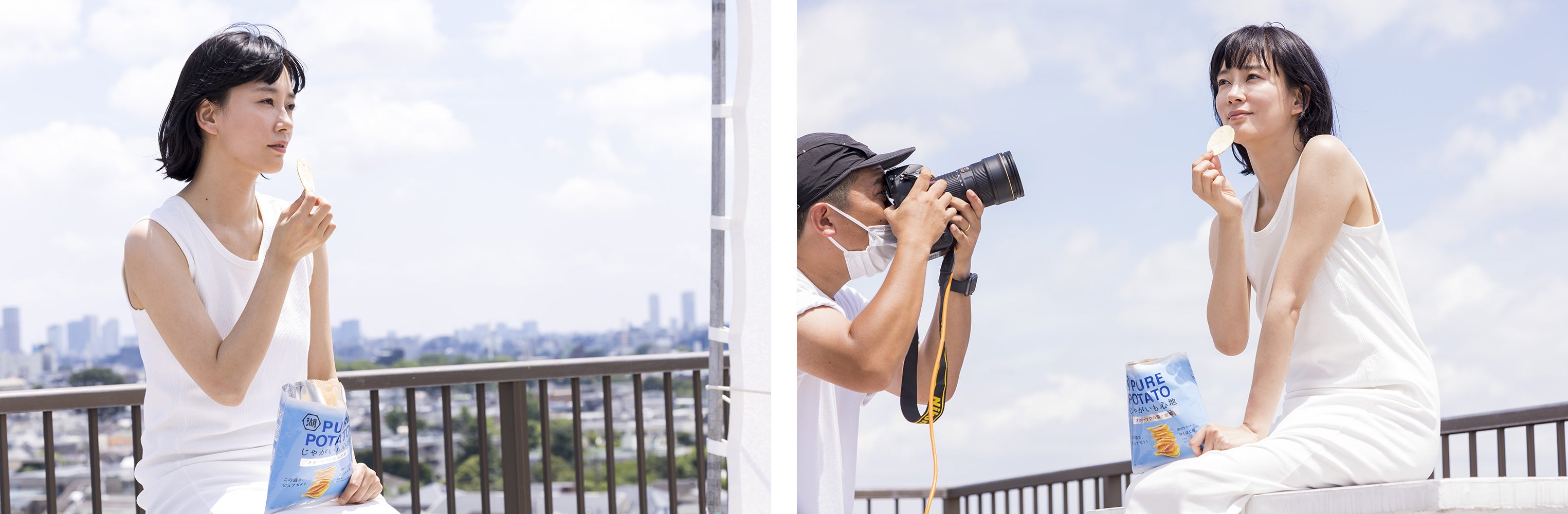 厚切りポテトを「バリッ!」と音を立てて食べて、と要望が出た時は、1テイク目で「バリッバリッ!」と頬張り、美味しそうな音が現場に響くと、「いいですね!素敵です!」と監督も大絶賛。今年でCMキャラクター3年目を迎えた水川さんは、じゃがいも心地を食べるシーンはもうお手の物のようでした。水川さんのプロ級の「バリッ!」の音と、幸せそうにじゃがいも心地を頬張る姿に注目ください!