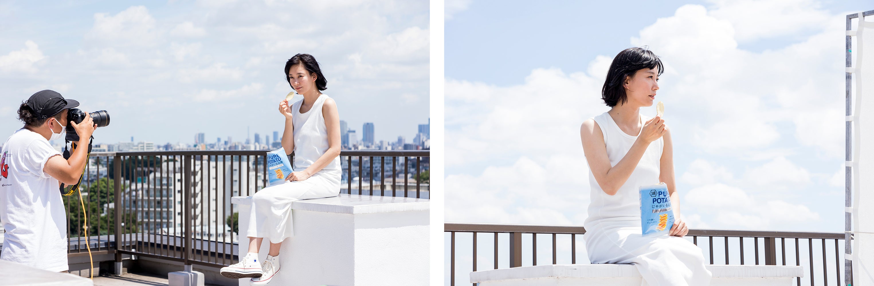 新CMでは、気持ちのいい青空の下、都会の中心に佇むビルの屋上で、一心不乱に「じゃがいも心地」を頬張る水川さんが、「じゃがいも心地」の「骨太で力強い生命力あふれるピュア」な世界観を表現しています。