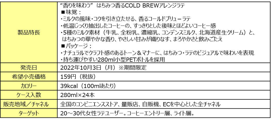 この秋、『UCC COLD BREW』 ブランドから、ラテと相性の良いはちみつをアクセントとした、この時期にぴったりの優しい甘さが嬉しいアレンジラテ、『UCC COLD BREW ハニーミルクラテ PET280ml』 を発売します。本製品は、『UCC COLD BREW』 ブランドの特長である 「低温じっくり抽出※」 で、コーヒーの香り高さと、苦味・雑味のない、すっきりとした後味を引き出しています。さらに、5種のミルク素材をブレンドすることで、しっかりとした飲みごたえとまろやかな口当たりのミルク感を楽しめ、はちみつの華やかな香りと優しい甘みが広がります。パッケージは、白を基調としたナチュラルでクラフト感が漂うデザインに仕上げました。 さらに、はちみつやカフェラテのビジュアルで、カフェのイメージを感じられるリラックスできるような世界観を表現しています。
