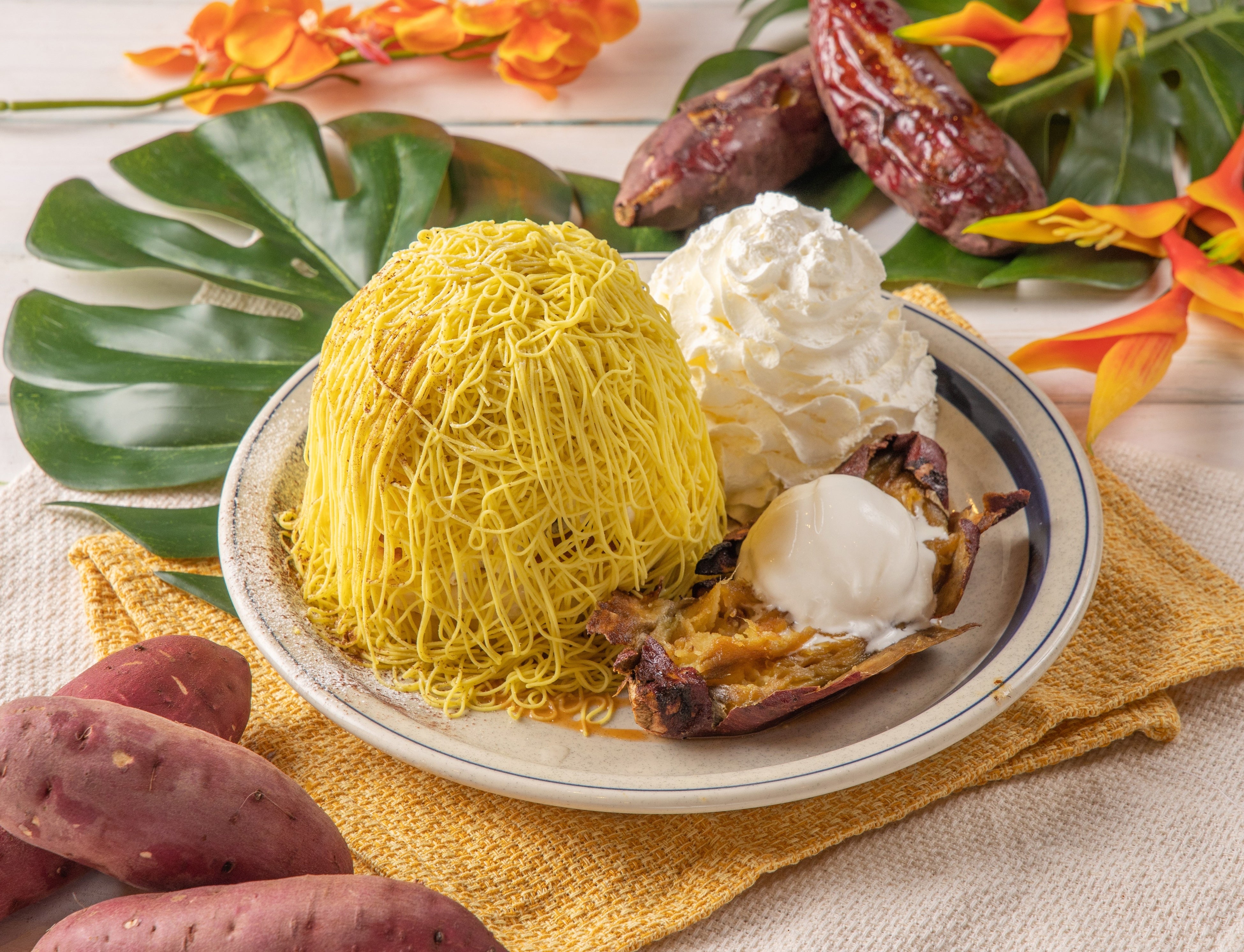 メニュー名にもなっている「ウアラ」は、ハワイ語で「さつまいも」。秋の味覚「さつまいも」は、ハワイでも人気の食材で、今年の秋はさつまいもをコナズ珈琲風ハワイアンパンケーキにアレンジしました。さつまいもの風味が引き立ったなめらかなさつまいもクリームと、さらにラム酒の香りをまとわせた香ばしい焼き芋、ハワイを感じるココナッツアイスクリームを掛け合わせたコナズ珈琲でしか食べられないハワイアンパンケーキをぜひご賞味ください。