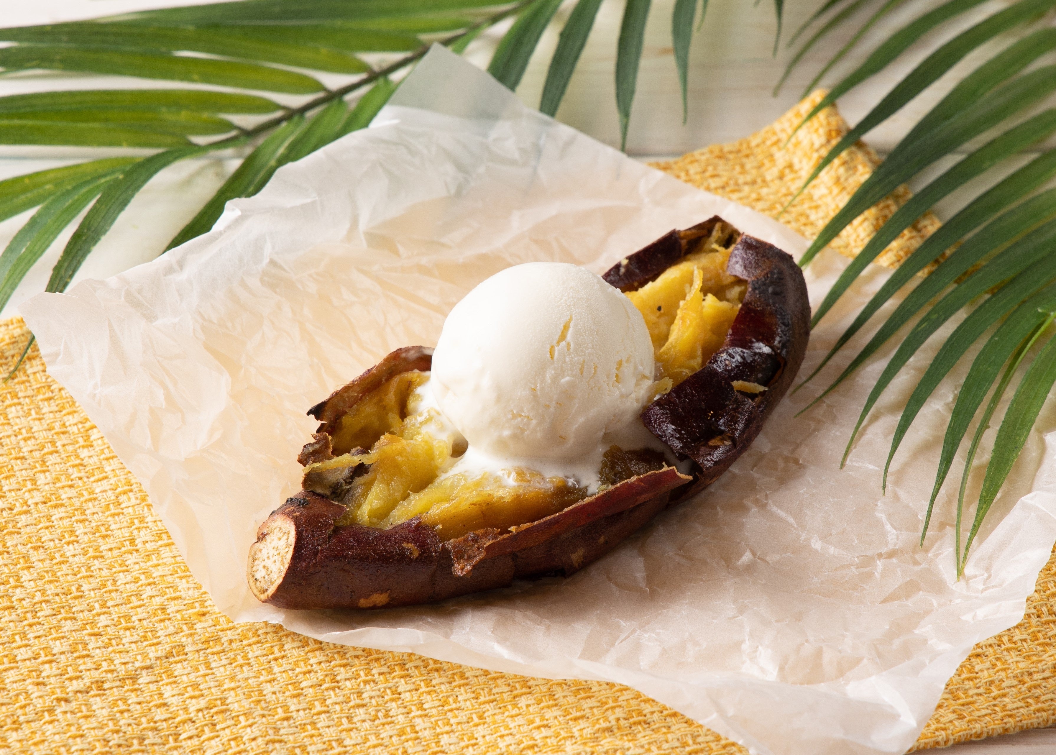 低温で甘みが引き立つようにじっくり焼き上げられたさつまいもを、ハワイ産のラム酒で香り付けし、仕上げにオーダーが入ってから高温のオーブンで香ばしくベイクします。香ばしく焼き上げた焼き芋は、皮ごと食べられ、パリッとした食感をお楽しみいただけます。