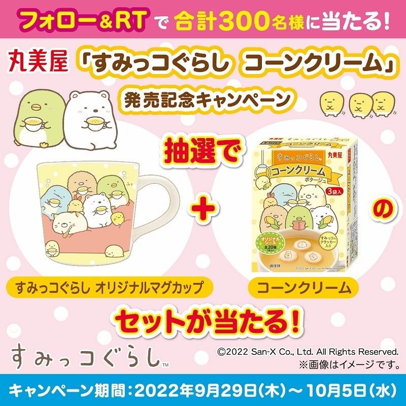 丸美屋食品工業株式会社(本社:東京都杉並区、社長:阿部豊太郎)では、2022年8月に新発売した「すみっコぐらし コーンクリーム」の発売を記念してTwitterキャンペーンを実施いたします。