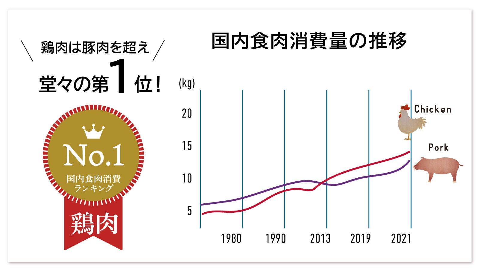 また、コロナ禍で自宅で過ごすことも多くなり、自宅でトレーニングをする人が増えたり、また昨今のスポーツやフィットネスブームによる身体づくりのための食事を見直す人も増え、高タンパク且つ低カロリーで、お財布にもやさしい食材として健康志向の高まりと共に鶏むね肉が注目されています。