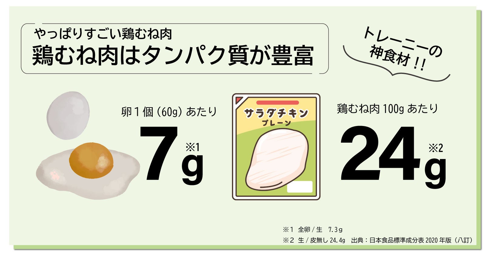 中でも鶏むね肉に豊富に含まれる栄養素「イミダゾールジペプチド」は疲労回復効果が高いと言われ、身体づくりに興味がある人の間で話題にもなったのも記憶に新しいところです。また、なんといっても鶏むね肉(皮なし生)100gあたりのタンパク質量は、約24g(日本食品標準成分表2020年版<八訂>より)とタンパク質が豊富なため、トレーニングする人達の神食材としても選ばれています。