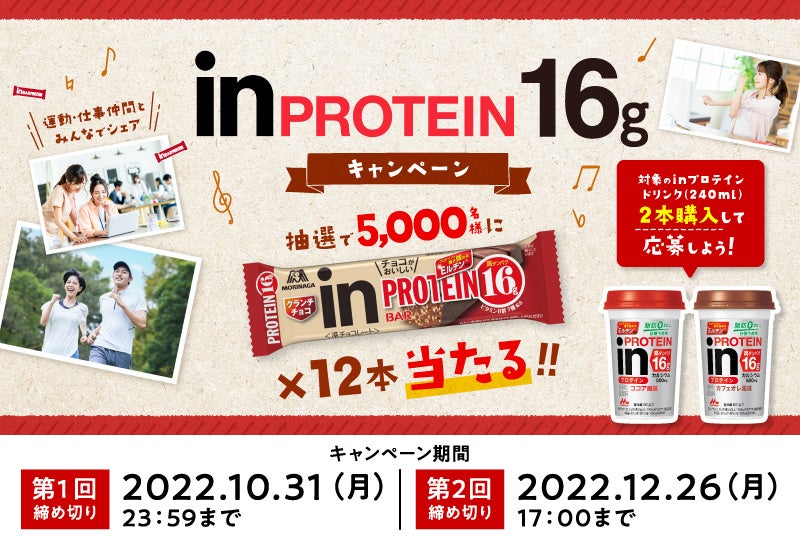 対象の森永乳業商品「in(イン)プロテイン ココア風味/カフェオレ風味」いずれか2本購入して応募すると、抽選で「inバープロテイン<クランチチョコ>」をプレゼントします。詳細は特設サイト(9月27日オープン予定)を