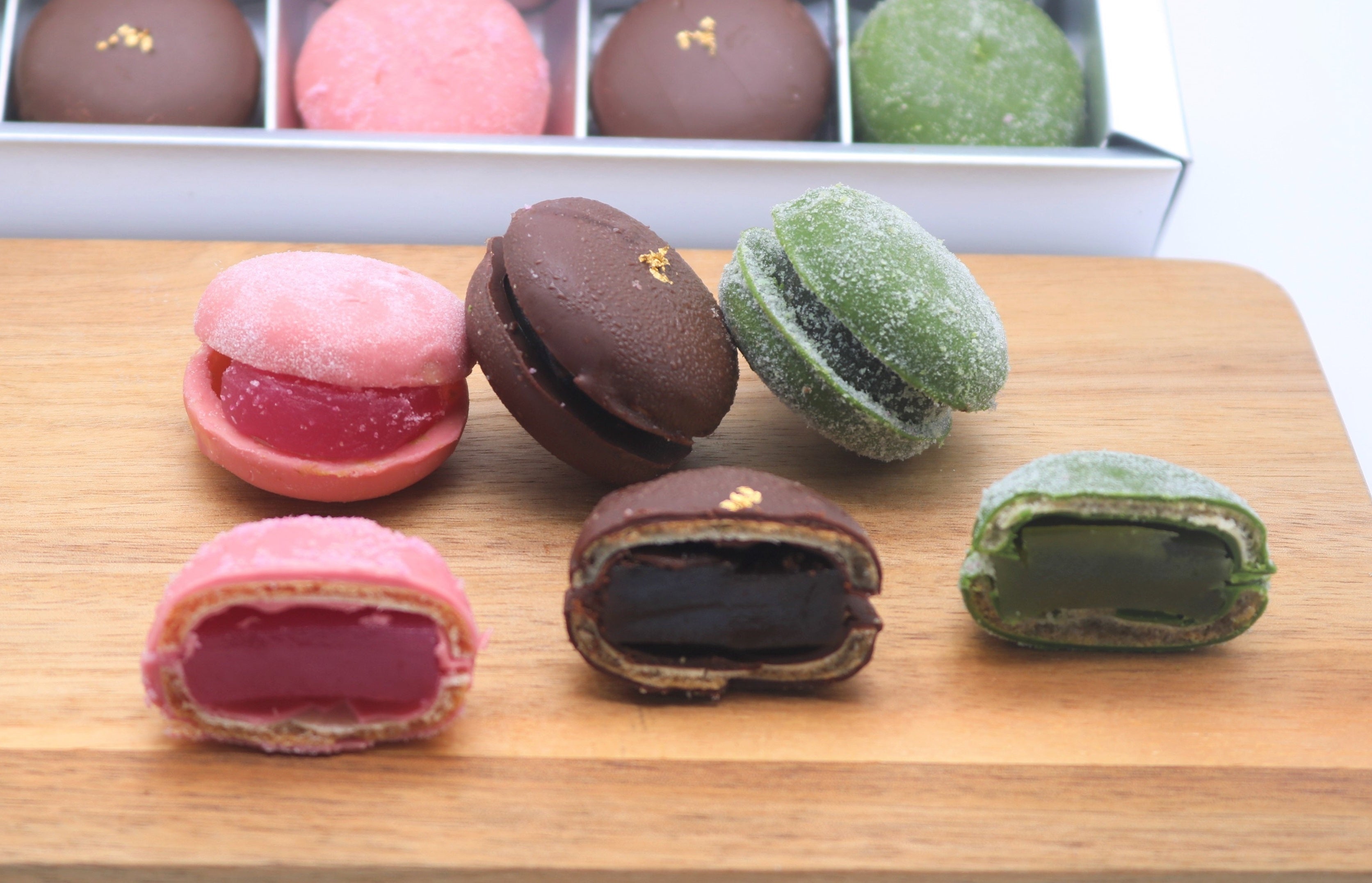 最中をチョコでコーティング。見た目にもかわいい、3種類の味を楽しめるアソートです。