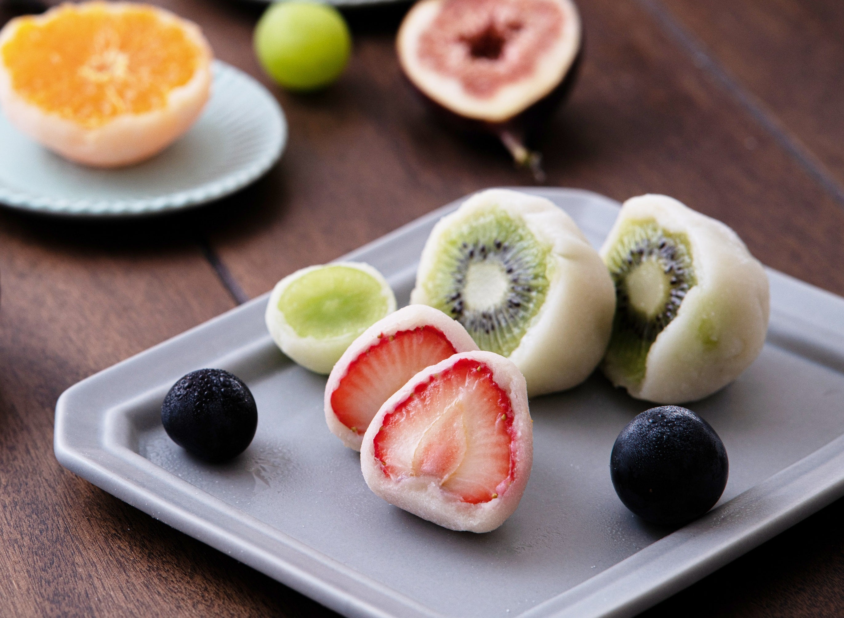 ジューシーなフルーツを甘さ控えめの白あんとお餅で包んだ、断面の華やかさも楽しめる大福です。