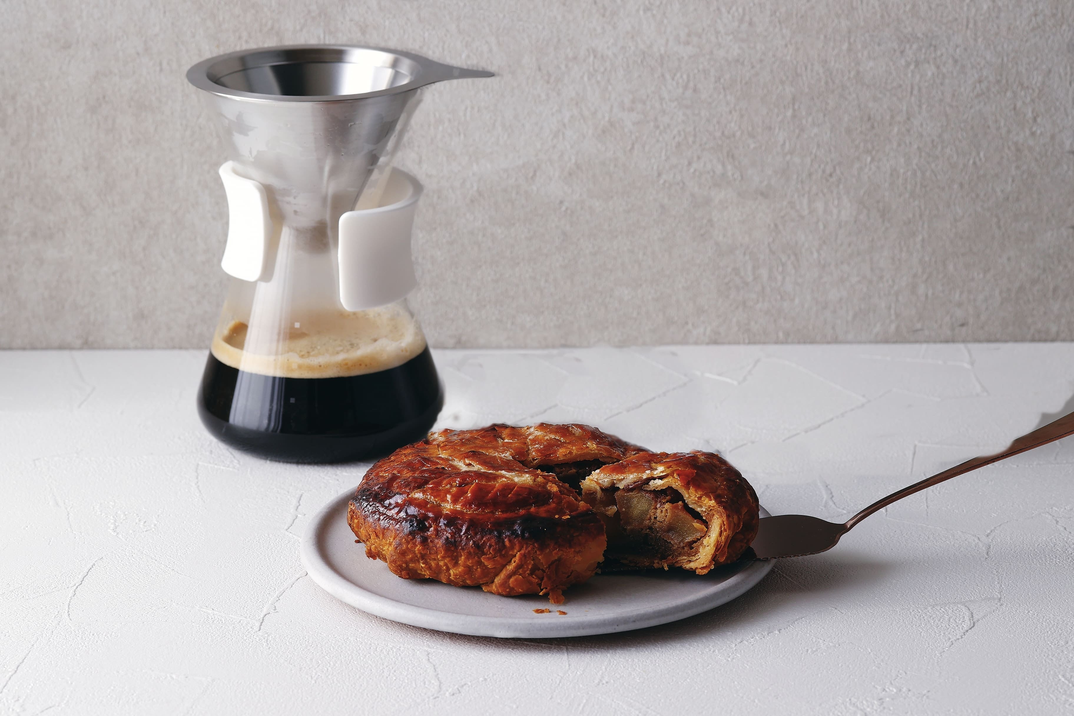 下に敷いたアーモンド生地に、細かくすりつぶしたコーヒー豆を練りこみました。パイの中にはスパイスの効いた自家製シーズニングに漬け込んだりんごとラムレーズンが入っています。