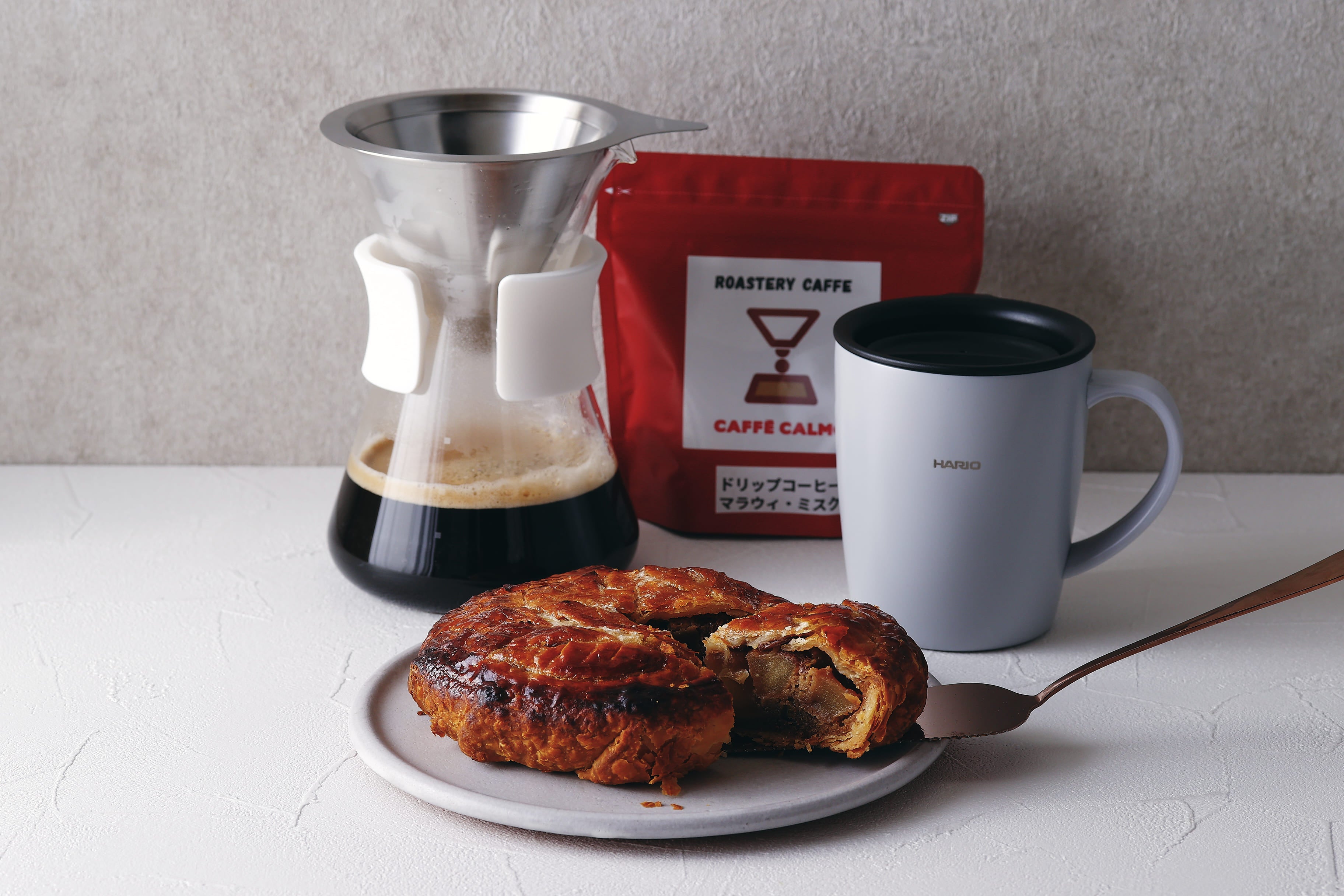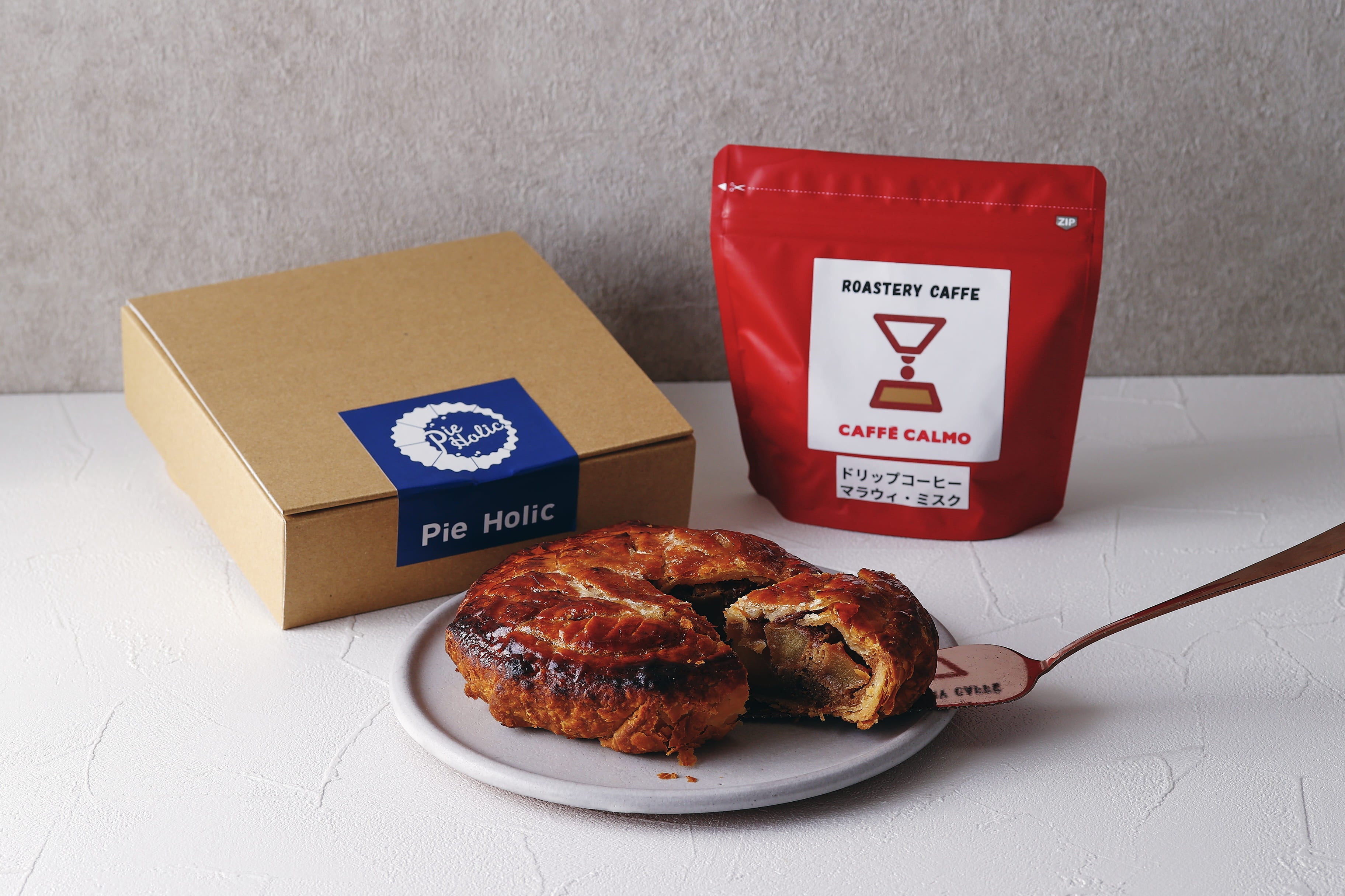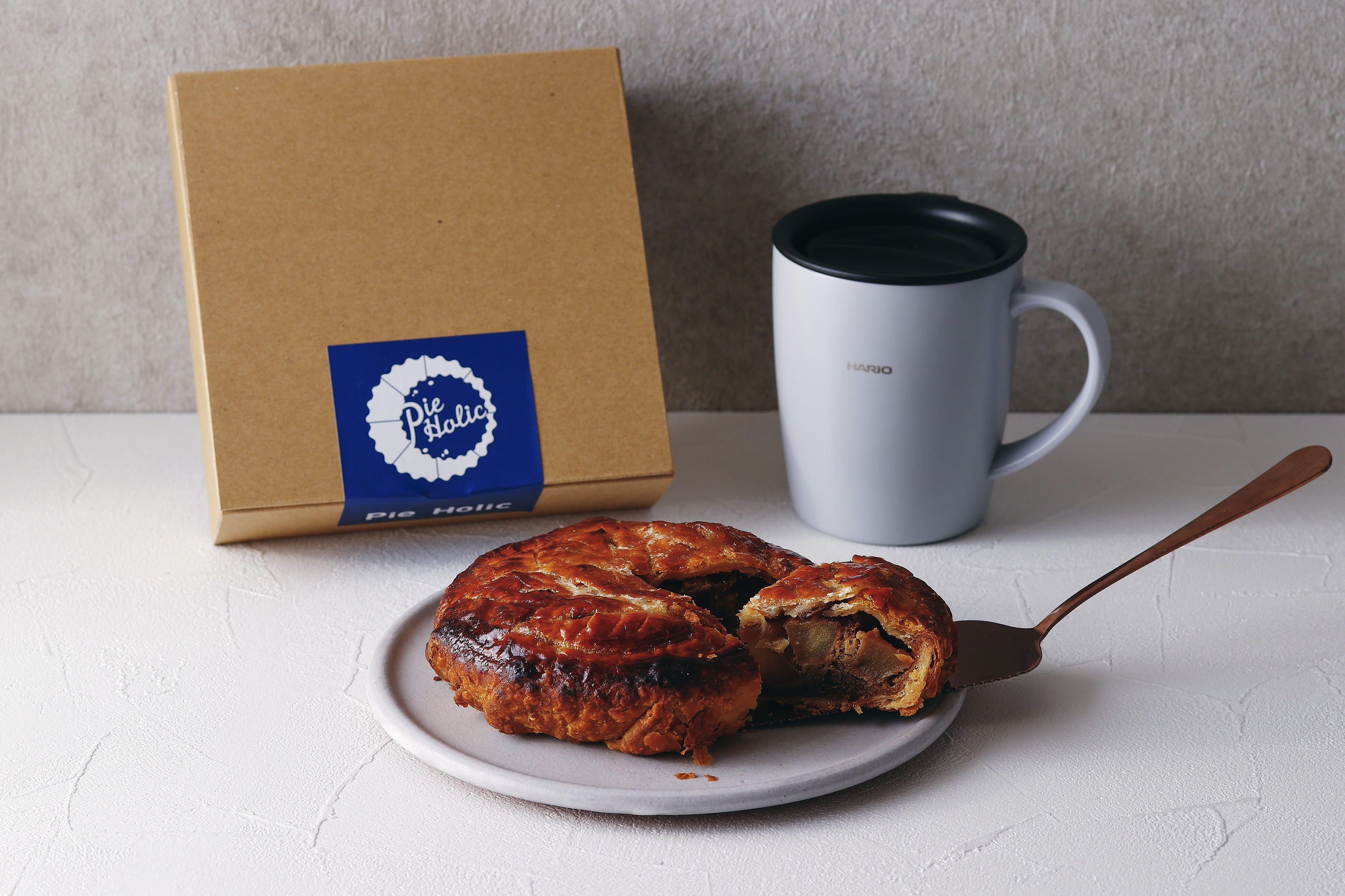 限定販売のセットは、Pie Holicのパイ、HARIOの保温マグとコーヒーメーカー、そしてHARIOのドリップコーヒーを組み合わせた全5種類です。パイは本セット限定の「コーヒーアップルパイ」をはじめ、「ダッチアップルパイ」「チェリーパイ」「アップルパイ」の4種類の中からお好きなものを選べます。また、セット内のドリップコーヒーは、水天宮駅前の自家焙煎珈琲店「CAFE CALMO」のオーナー 関口恭一さんが、Pie Holicのパイにあわせてセレクトしたマラウィ ミスクという豆を使用しています。