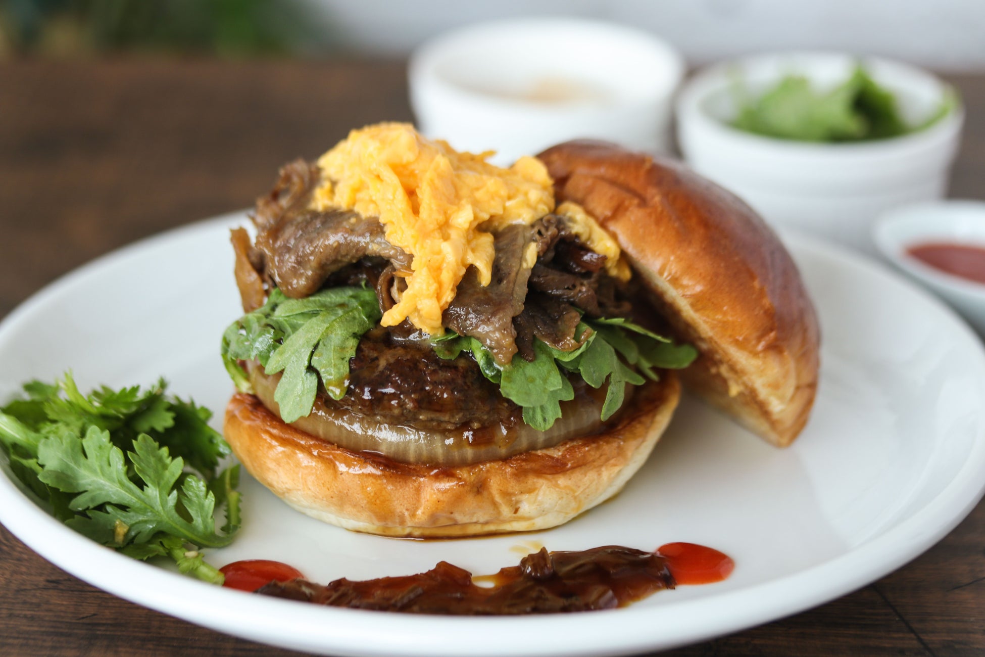 すき焼き肉には”天然醸造醤油”と”沖縄黒糖”の極上割り下で、粗挽きパティには焦がしネギソースで味付けしました。国産牛100%の2種類の触感を味わえます。春菊と卵黄ソースのアクセントが抜群です。別添えの薬味で、味の変化も楽しめます。