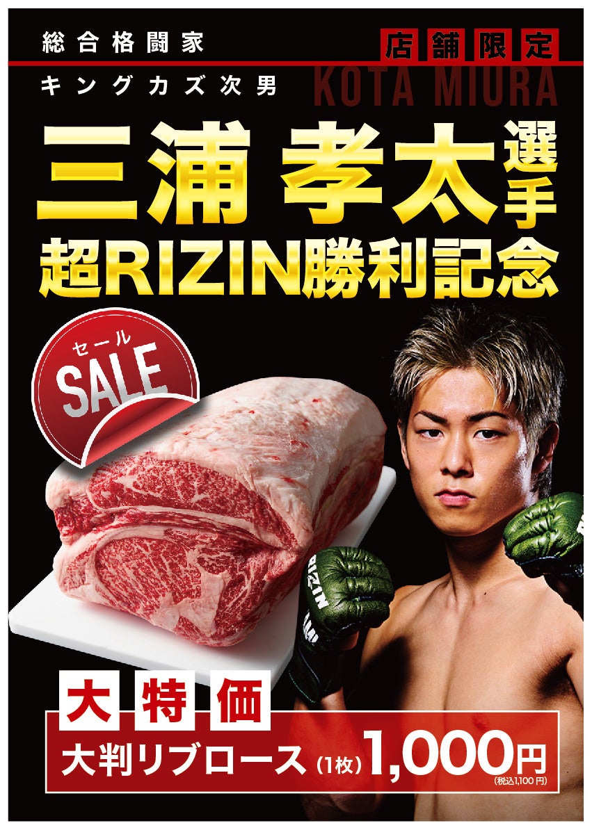 総合近江牛商社の公式アンバサダーである総合格闘家の三浦孝太氏の超RIZINでの、ブンチュアイ・ポーンスーンヌーン戦の勝利を記念して、大判リブロースを通常2,980円のところを1,000円で販売いたします。