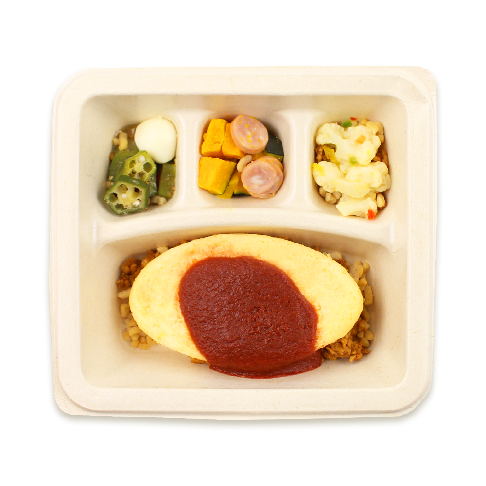 創作オムライス専門店「ポムの樹」監修プレートです。低糖質・低塩分のオリジナルケチャップを使用し、どこか懐かしいオムライスに仕上がりました。糖質を抑えるために、大豆を原料にしたそぼろをお米に見立てました。カロリー、糖質、塩分を抑えた嬉しい1品です。(当社比較による)