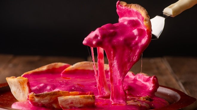 生地をカットした時に溢れ出すチーズはまるで決壊したダムのよう!カラフルな色味を加えたシカゴピザは、まさに”ムービージェニック”抜群の商品となっております。