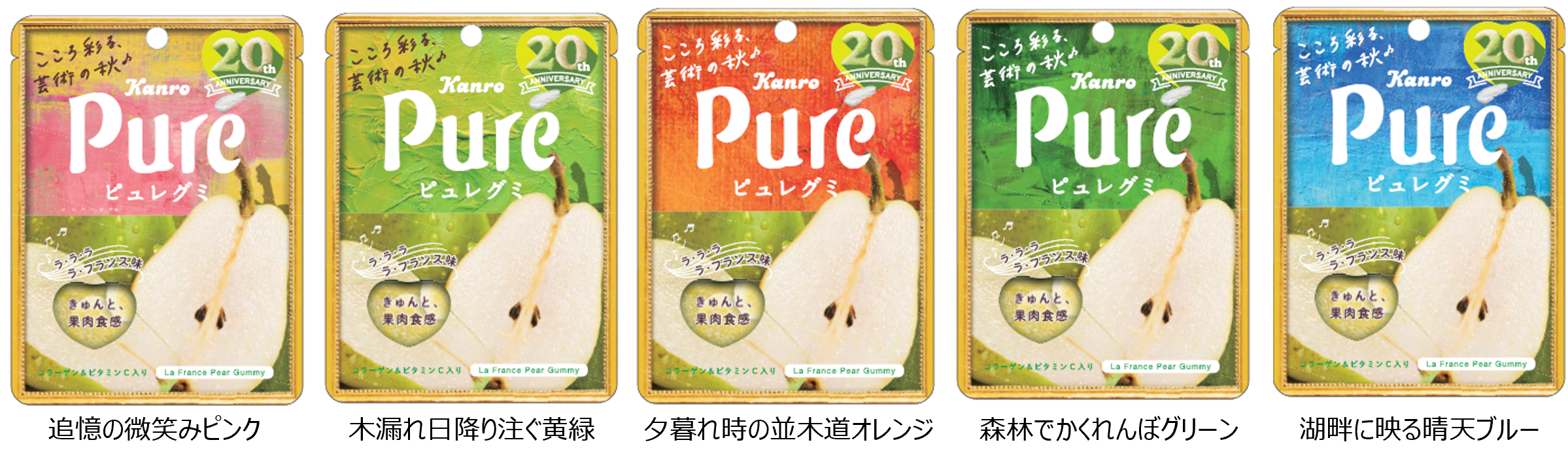 『ピュレグミ』は、2002年の発売以来、幅広い世代の方からご支持いただいているカンロの人気商品です。フルーツのおいしさを引き出す“すっぱいパウダー”と独自の“果肉食感”により、噛むほどにフルーティーな甘ずっぱいおいしさが広がり、食べた瞬間こころが晴れるように、ちょっとハート(気持ち)があがるハート型のグミです。ピュレグミは今年で20周年。「ときめく風に、乗れ。」というメッセージを通じて、みなさまのときめく気持ちを応援していきます。
