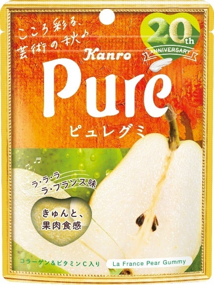 今回発売する「ピュレグミラ・ラ・ラ ラ・フランス」は、秋に旬を迎えるラ・フランスの果汁を使用しました。まるで果実をイメージしたかわいらしいツートンカラーのグミ粒で、ラ・フランスの香り高く、とろりとした濃厚な味わいを表現。ピュレグミおなじみの甘ずっぱさと心地よい果肉食感で楽しめます。