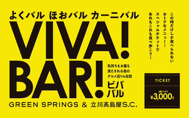 (株)立飛ストラテジーラボ(本社:東京都立川市/代表取締役:村山正道)が運営する複合施設GREEN SPRINGSにて、バル企画参加店舗を巡り、チケット制で食べ・飲み歩きを楽しむイベント「VIVA!BAR!(ビバ!バル!)」を、10月24日 (月)~10月27日 (木)に開催します。今回は立川髙島屋S.C.とタイアップし、同施設の一部飲食店も参加します。