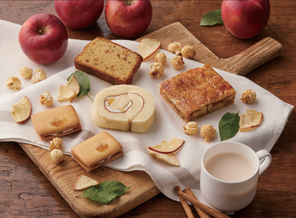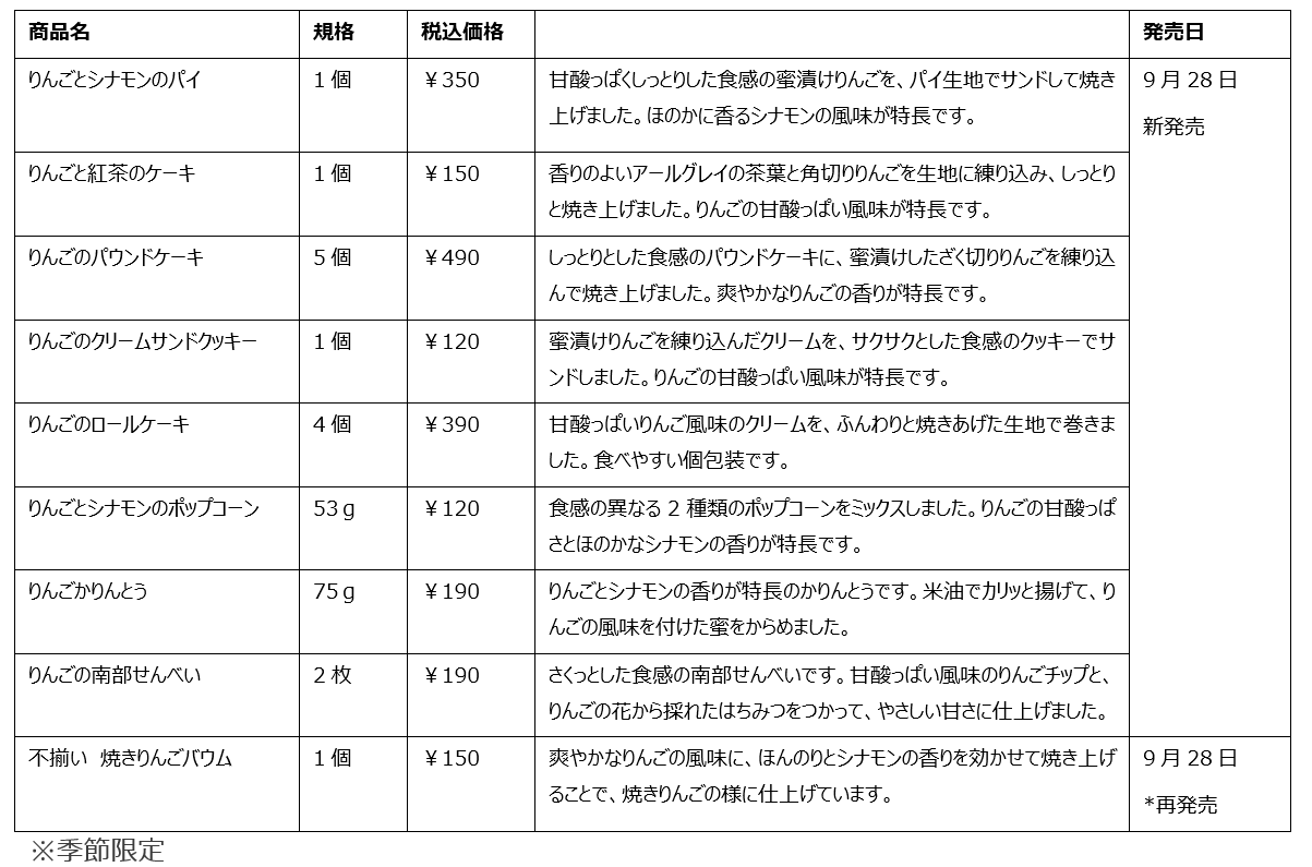 「りんごとシナモンのパイ」は、甘酸っぱい角切りりんごを砂糖で煮詰めてパイ生地でサンドし、しっとりと焼き上げています。「りんごとシナモンのポップコーン」は、りんごの爽やかな甘みにシナモンの風味を加えることで、コクのある甘みに仕上げました。「りんごの南部せんべい」は、サクッとした食感の南部せんべいに、りんごチップをトッピングしています。