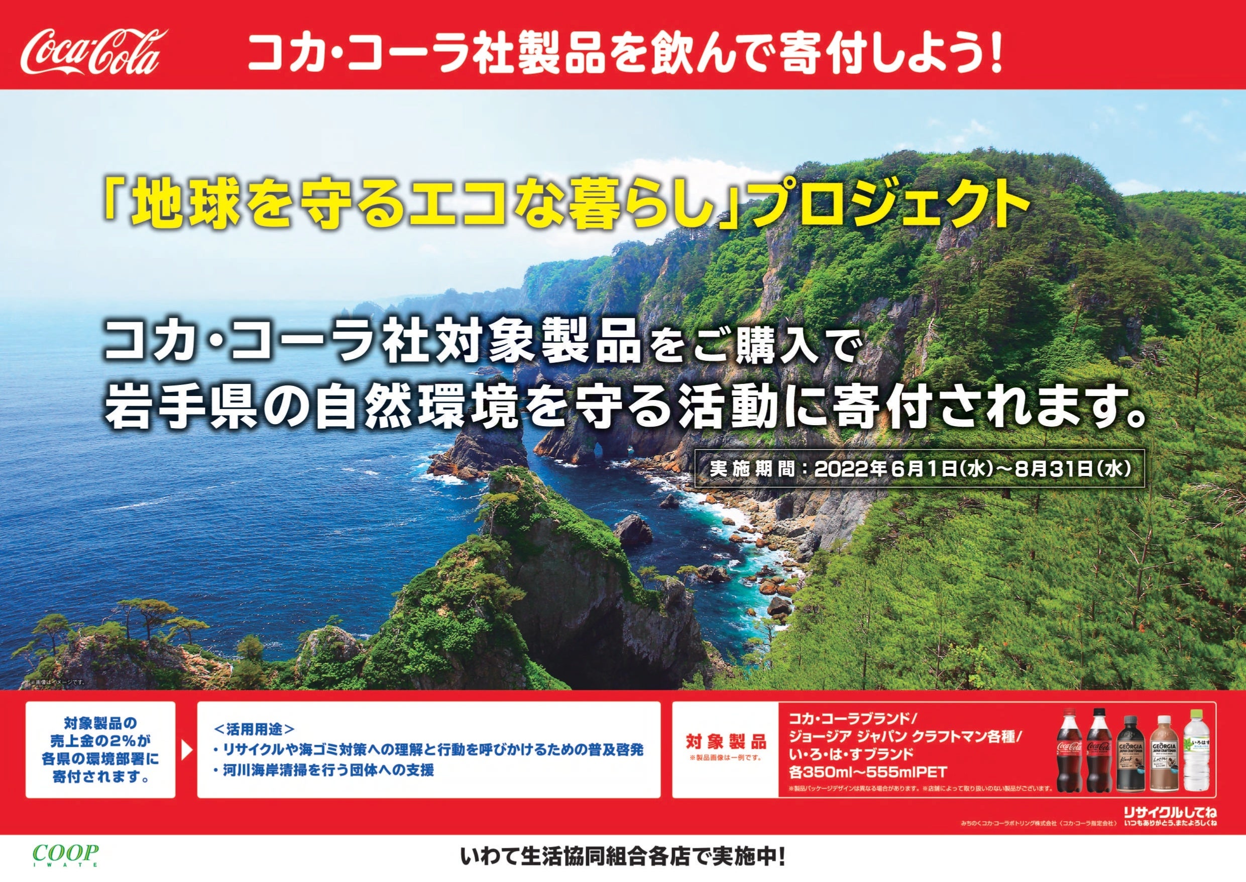 このプロジェクトは、6月の「環境月間」を県民へ周知し、環境の保全についての関心と理解を深め、積極的に環境保全活動を行う意欲を高めていただこうと、いわて生協各店での店頭キャンペーンとして展開したものです。対象製品の売上の一部がそれぞれの県へ寄付され、海洋ごみ対策への理解と行動を呼びかけるための普及啓発や、河川海岸清掃を行う団体への支援に活用されます。対象製品は、「コカ・コーラ」「ジョージア ジャパンクラフトマン」「い・ろ・はブランドの各350~555mlPETの計9品目で、いずれも100%リサイクルPETボトルを使用しています。