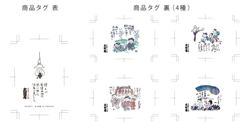 商品タグには太郎庵のログや包装紙などを手掛けた画家・横田新氏のイラストがランダムに印刷されたオリジナルタグを採用。「ブランドカラーの可視化」のために細部までこだわりました。