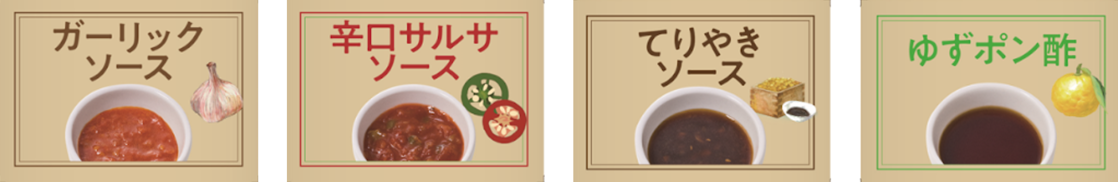 ※各テーブルには下記のソース以外にも、おろし玉ねぎソースと、胡麻にんにく醤油ソースを設置しております